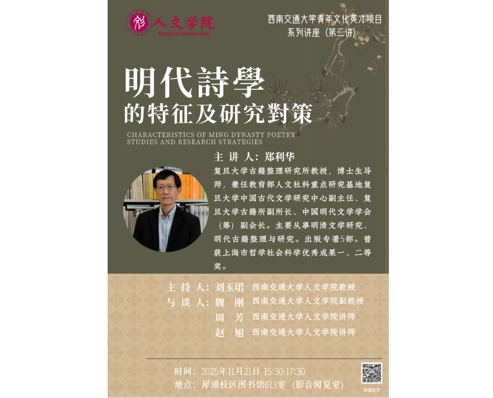 主讲人:复旦大学古籍整理研究所 郑利华教授讲座时间:2025年11月21日 15:30-17:30讲座地点:犀浦校区图书馆613室(影音阅览室)主办单位:西南交通大学人文学院主持人:西南交通大学人文学院 刘玉珺教授主讲人介绍:郑利华,复旦大学古籍整理研究所教授,博士生导师,兼任教育部人文社科重点研究基地复旦大学中国古代文学研究中心副主任、复旦大学古籍所副所长、中国明代文学学会(筹)副会长。主要从事明清文学研究、明代古籍整理与研究。...