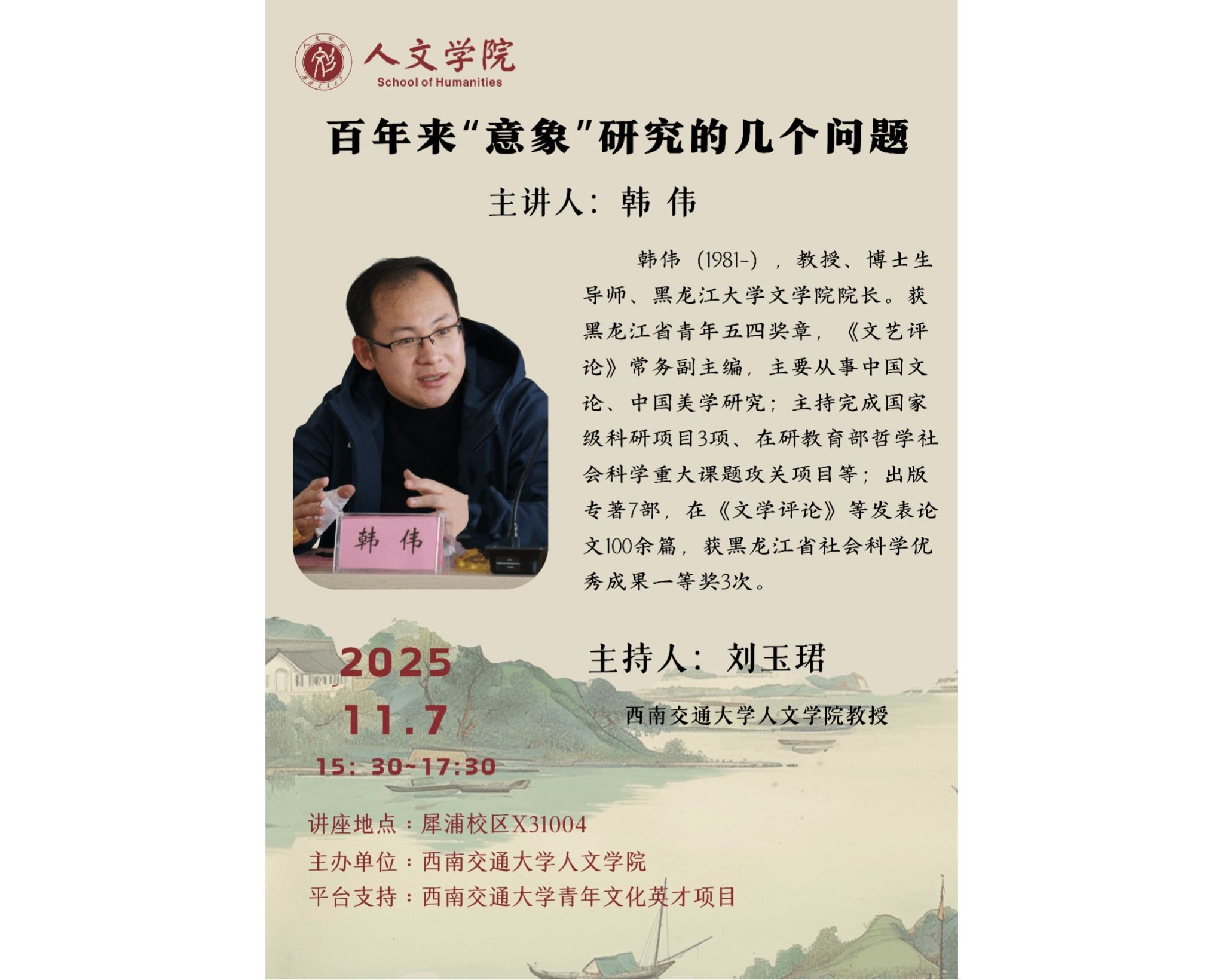 主讲人:黑龙江大学文学院院长 韩伟教授讲座时间:2025年11月7日 15:30-17:30讲座地点:犀浦校区X31004会议室 主办单位:西南交通大学人文学院主持人:西南交通大学人文学院 刘玉珺教授主讲人介绍:韩伟(1981—),教授、博士生导师、黑龙江大学文学院院长。多次入选国家级青年人才计划,获黑龙江省青年五四奖章,《文艺评论》常务副主编,主要从事中国文论、中国美学研究;主持完成国家级科研项目3项、在研教育部哲学社会科学重大课题攻关项目等;...