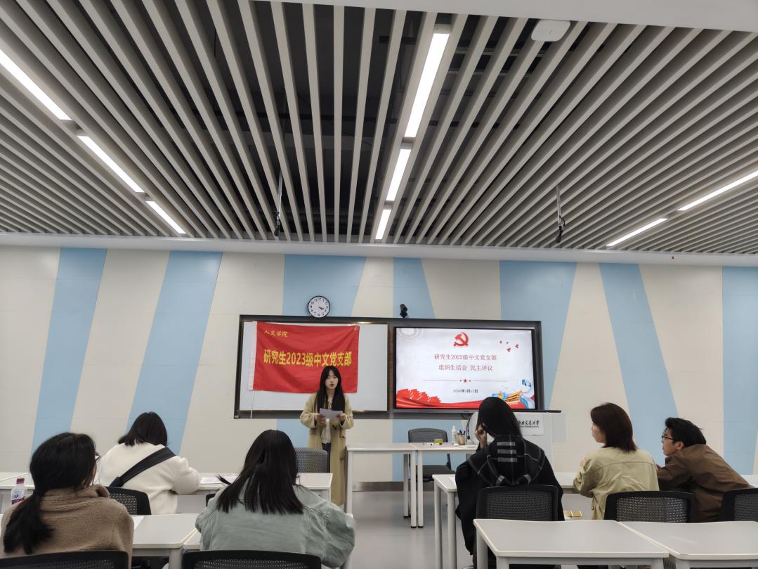 2026年3月12日16:00,人文学院研究生2023级中文党支部在九里校区J4204开展了3月主题党日活动暨2025年度民主生活会。学院党委委员吴德利老师到会指导。会议主要内容包括理论知识学习以及民主评议。本次会议由党支部书记王艺橙主持,支部成员参加会议。