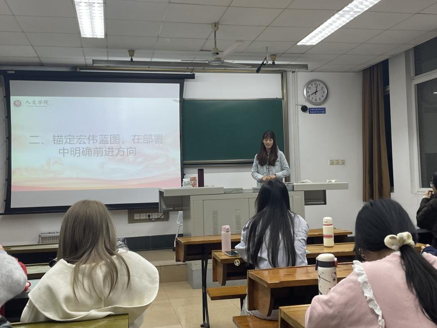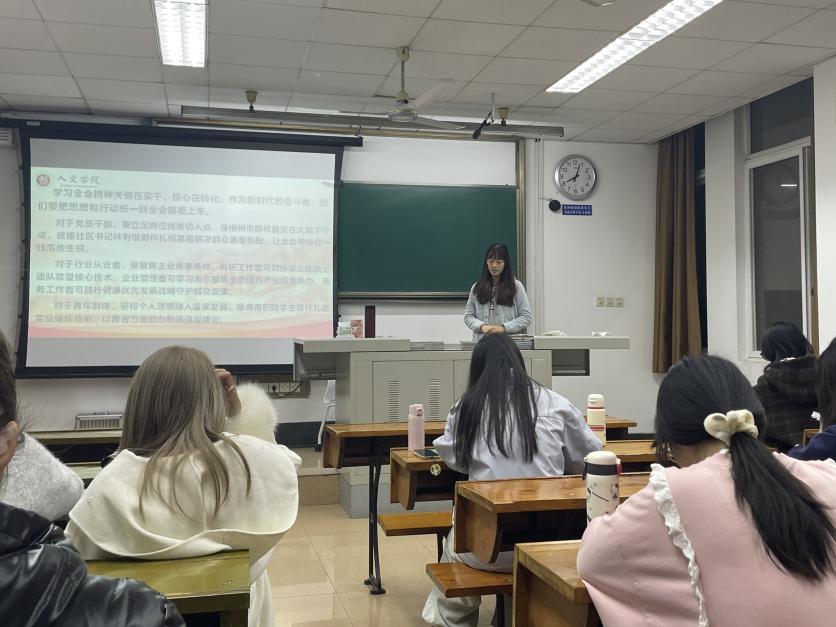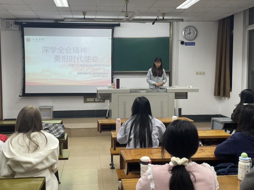 2025年11月5日20:00,西南交通大学人文学院研究生会于九里校区J4321教室举办主题为“深学全会精神 勇担时代使命——党的二十届四中全会精神学习领读”的思想政治学习会,本次学习由赖秋蕊同学主讲,人文学院研究生会全体成员参与。