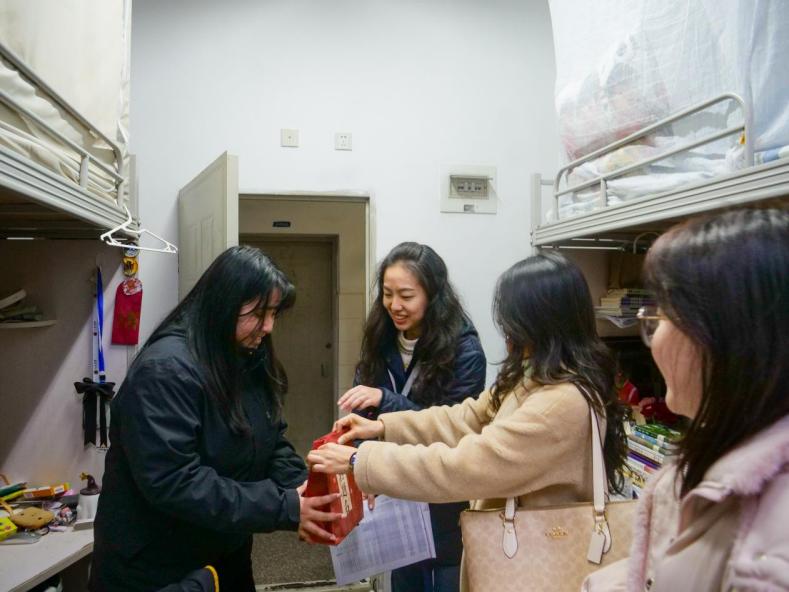 走访慰问活动还特别聚焦考研学子群体,陈曦轶副书记代表学院为备考学生送上“金榜题名”加油礼包,致以诚挚祝福与殷切期望,暖心叮嘱大家调整心态、合理安排作息。