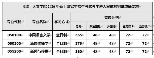 第一志愿报考我院各专业的考生,初试成绩达到下表中对应专业的成绩要求,方才具备复试资格。