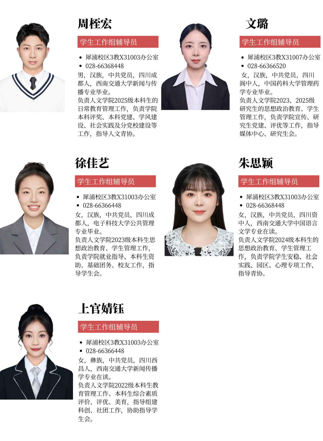 学院学生工作组目前共有专兼职辅导员六名,坚持以团队为抓手,着力提升立德树人成效。学院抓好学生和学工队伍建设,抓住重点学生帮扶和培养,提升育人成效。我院学生会、研究生会、青年志愿者协会、媒体中心四大学生组织获得学生组织十佳大满贯。学院学生连年获评学校最高个人荣誉竢实扬华奖章,我院学生连续两年担任四川省学生联合会执行主席,校级学生组织优秀个人荣誉称号我院有61人,占比全校20%。学院学工建设如火如荼,学生成长成才全面开花!
