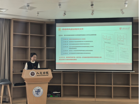 人文学院召开师德师风专题宣讲会为大力弘扬教育家精神,进一步加强学院教师思想政治和师德师风建设,2025年10月16日下午4:00,人文学院在犀浦校区X31022报告厅召开以“恪守十项原则,涵养高尚师德”为主题的师德师风专题宣讲会议。会议由学院院长刘占祥主持,学院党委书记罗妍妍作主题宣讲,全院教职工参与学习。